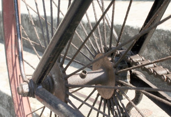 The Model F with its distinctive ‘trough tubing’ is a rare model these days. The rear wheel has some rust in it, and one pedal rubber has been replaced. The transfer (decal) appears to be in too good condition to be original, so it may be a later addition. Otherwise it’s in very good original condition, and I’ve ridden it.
