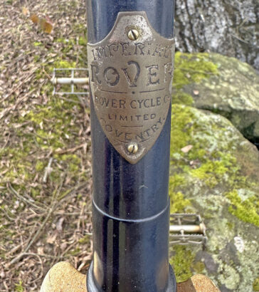 I’m not sure which is rarer, this 1899 Imperial Rover racing machine, or its set of original tyres: the front tyre is a 28 x 1 1/4″ pneumatic which has a diameter of 29″. The Rover was the most successful path racer of its time, and this led to many sales of its bicycles. The Road Racer was a slightly more sturdy version of the path racer, but both were lightweight.