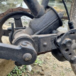 I bought this odd contraption from The Science Museum. According to their records, item no 1968-570 was acquired in 1968 from the Surrey branch of the Cyclists’ Touring Club. They didn’t know what it was, but closer inspection reveals it to be a patent model for a rear brake. The frame appears to be that of a Marriott & Cooper Humber, which has been adapted at the open steering joint and bottom bracket, using wood, to accept the rear brake apparatus. The wooden cylinder seems to have been used to support the bottom of the down tube and seat tube, as the bottom bracket has been moved to fit the brake mechanism. It has also had a small bridge fitted between the seat tube and the rear mudguard for additional support. Marriott & Cooper used a similar bridge on their ‘Model B’ of 1891.