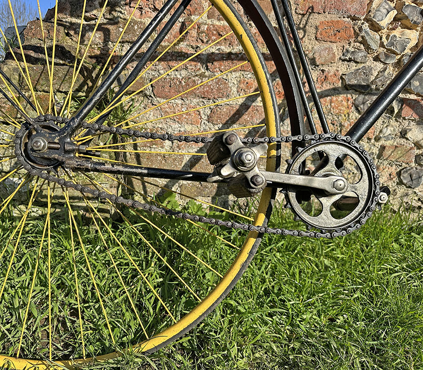 This example is an old-time restoration. Its paintwork has weathered a bit, though the nickel brightwork is still shiny. The only job I would do on it is to rub off the yellow paint on the spokes and hubs. It’s always a good idea to grease up the plain bearings on the open steering before riding a safety bicycle of this era, otherwise it’s ready to ride.